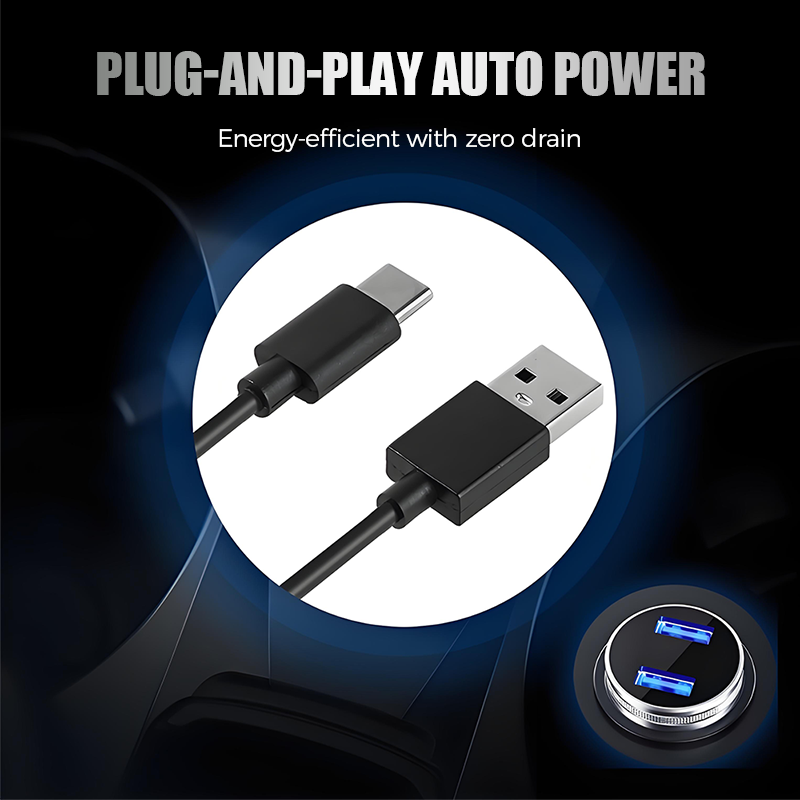 PLUG-AND-PLAY USB WITH AUTO POWER - Simply connect to your car's USB port for instant, low-energy power. It automatically turns on with ignition and off with engine stop, ensuring zero battery drain when parked while offering a seamless, hassle-free experience.