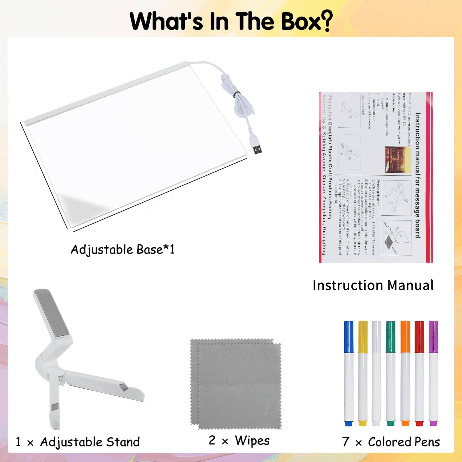 - Before using our LED acrylic erase board, please remove the double-sided protective film. Use and adjust the included foldable triangular stand and place the message board on it.