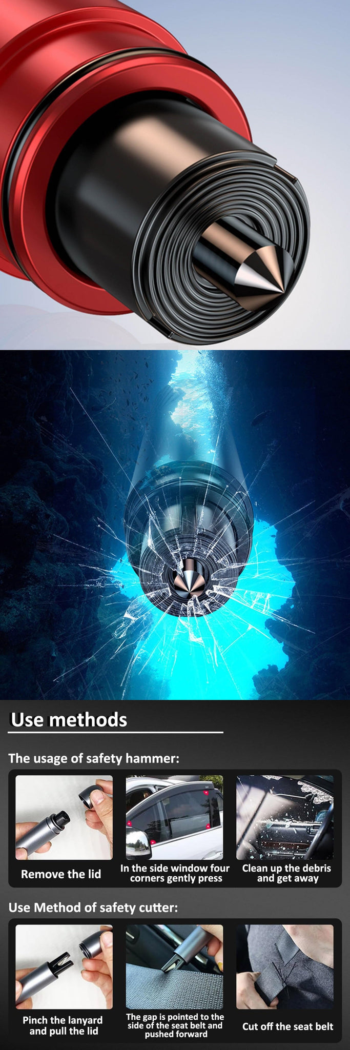 WIDELY USED: This glass breaker is suitable for rescue, disaster response, escape, lifesaving, and any unexpected situations. Important Note: Only the tempered glass of the side windows of the car can be broken, and the laminated glass such as the front and rear windshield sunroofs cannot be broken. It's absolutely worth it.