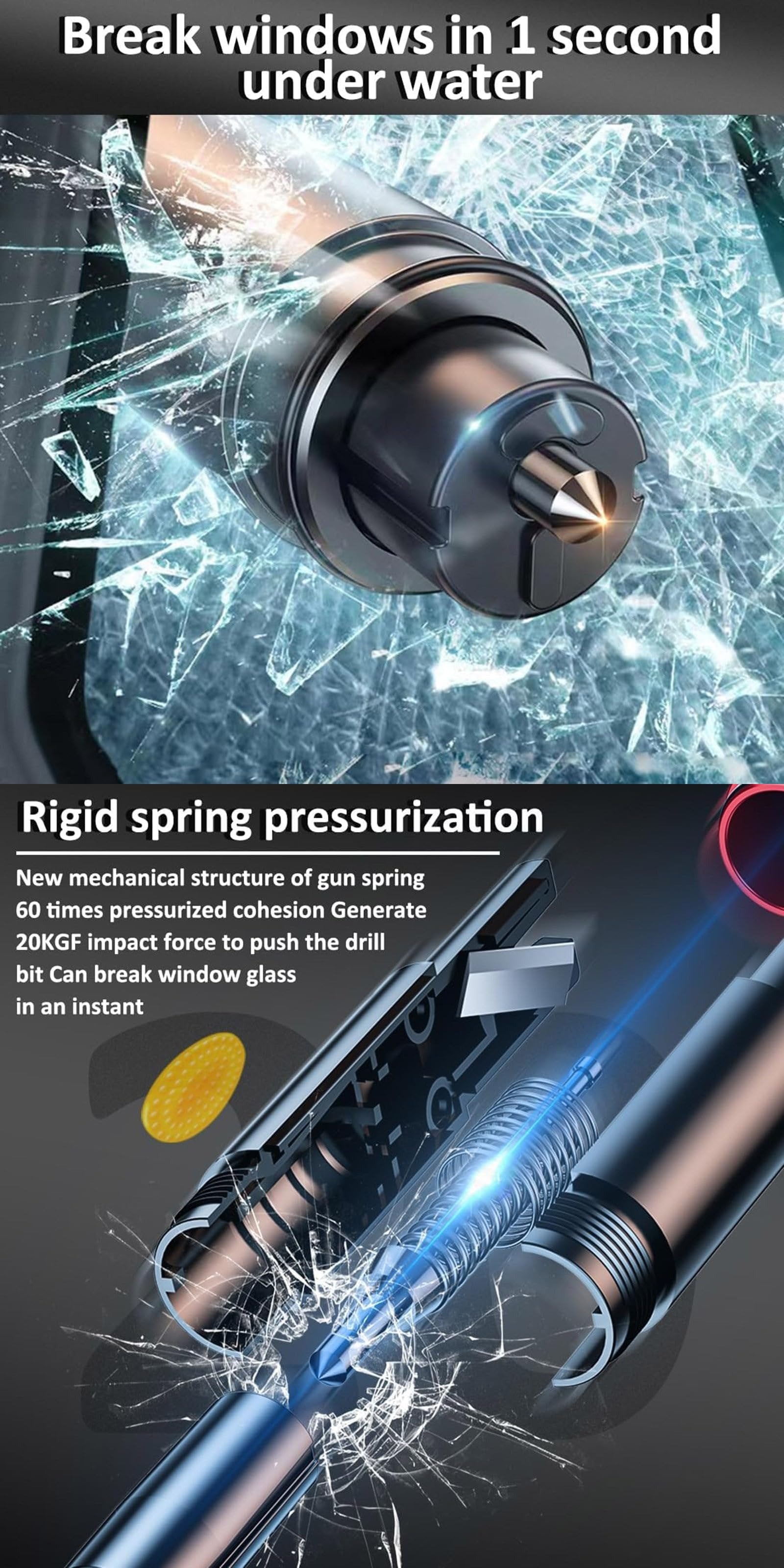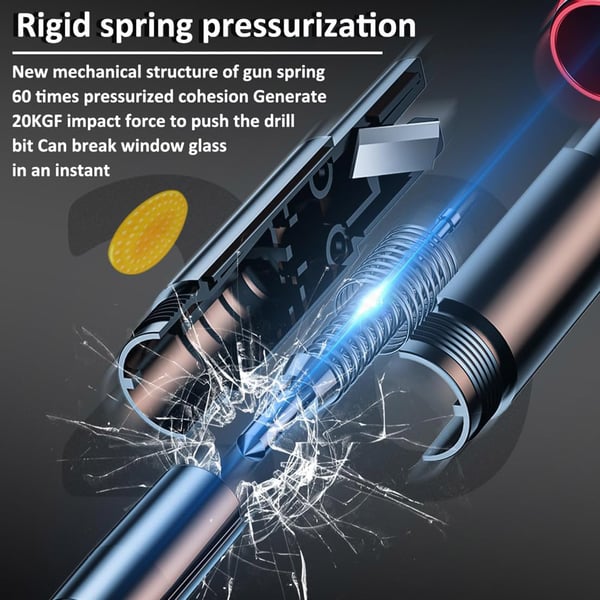 VEHICLE WINDOW BREAKER: This 2-in-1 safehammer glass breaker has a built-in high-pressure spring and a sturdy tungsten steel blade with a hardness of 55. Along with a 6KG impact force can break the solid window glass in an instant. Note: Metal Tip Stays Inside The Tool - Only Springs Out When Breaking Glass.