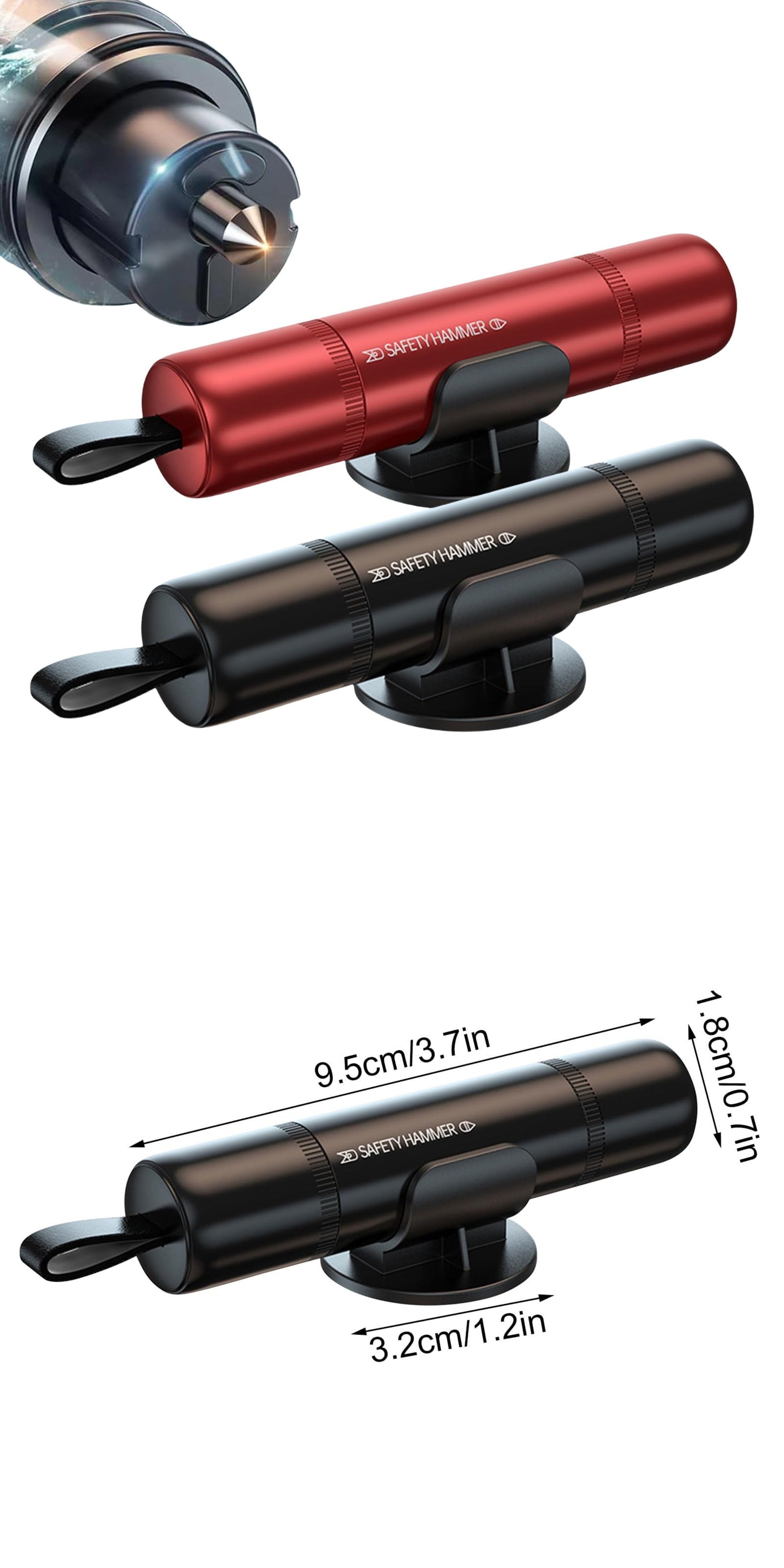 Fashionable Compact Mini glass breaker:life hammer for car (with base) Aluminum alloy Frosted material, multiple color styles Available to match your car. Durable, lightweight and powerful. It is recommended to buy two, one in the front row and one in the rear row, and stick them in the car to make it safer.